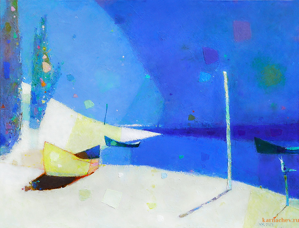 Дух захватывает - как это красиво! Синева... Краски говорят сами за себя! А с их "слов" стекает восхитительный образ бухты, возникший у Художника и переданный зрителю... А он, даже не бывавший в Новороссийске, вдруг понимает, что любит этот город у моря... И особенно - бухту!..